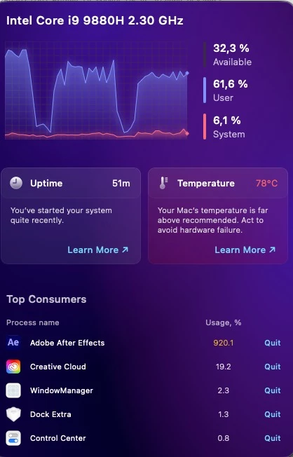 Hello comunity, I'm having this really odd trouble with an Macbook Pro 16" 2020: as you can see in this ClearMyMac print below, AE 2025 and 2024 is taking really more from CPU than it should. This laptop has an AMD radeon dedicated GPU, but AE is not using it significantly, at least to not heat up to 78°C