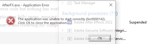 After effects keeps shutting down on start up giving me the error code 0xc0000142