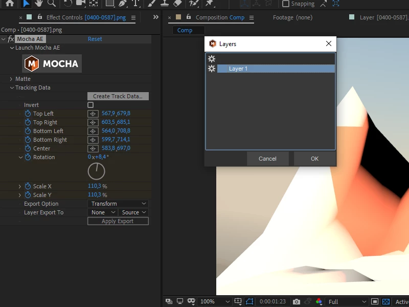 1st image: The tracking in Mocha is perfect(trans, scale, rotate) I turn it off and return to the AE interface and press Create Track data and choose "Layer 1"