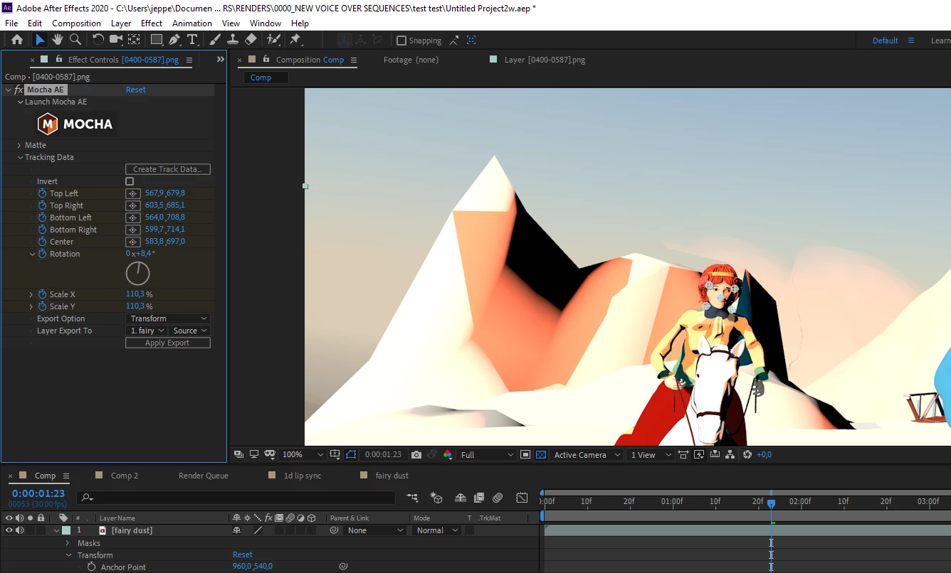 4th image: In the Mocha effects panel I choose the "transform" option and then layer expor to "Fairy dust" the 5 dots appear on the face of the princess - and follows the movement of her face, so everything seems perfect so far!