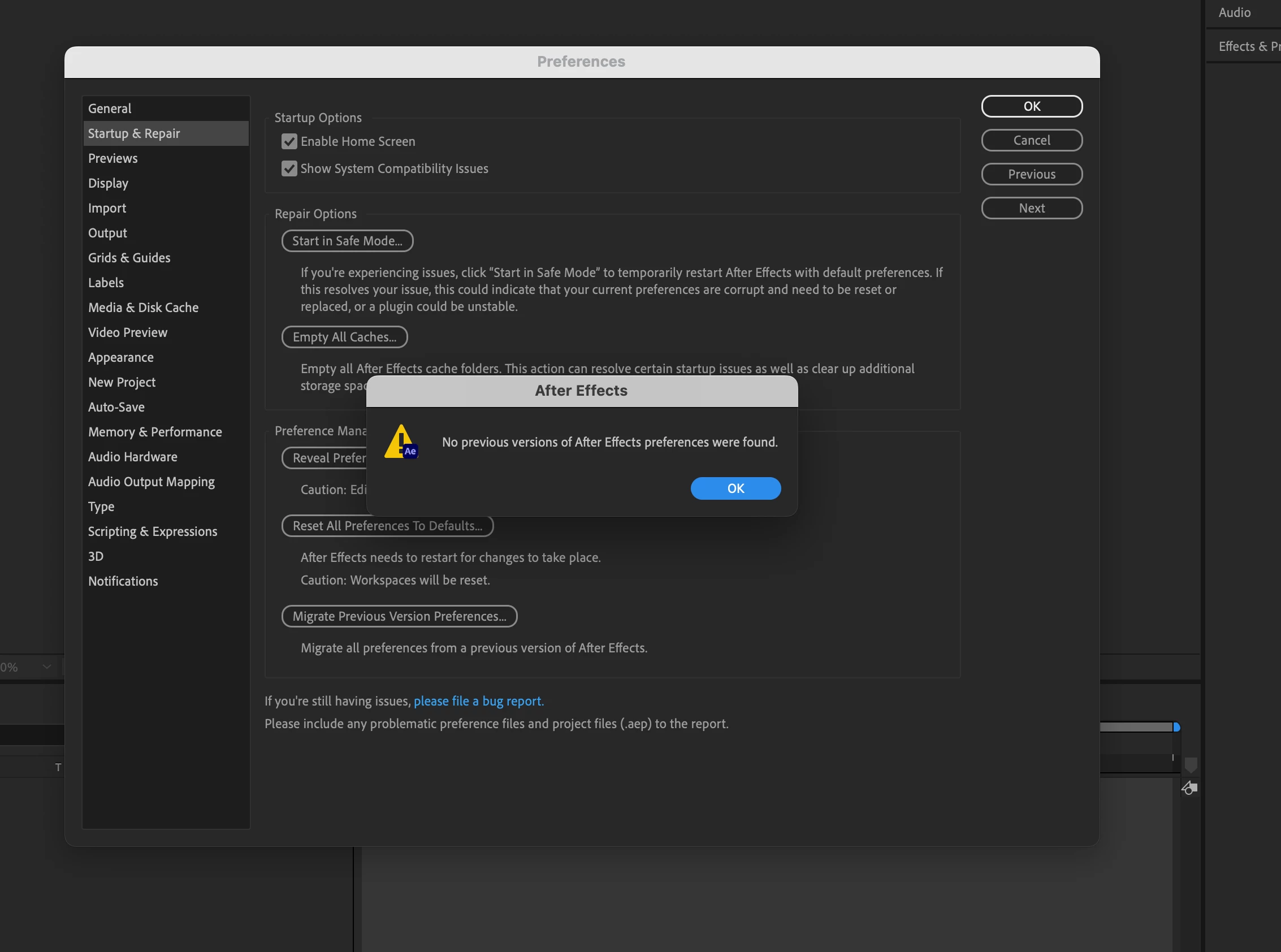 3. Once that inevitably doesn't work, enter the new version and Go to Prefs -> Startup and Repair, and click "Migrate Previous Version Preferences." You'll get an error that says "No previous version preferences."