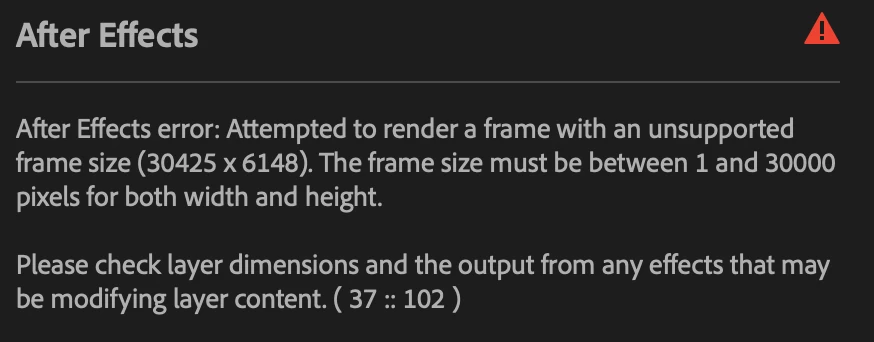 Hello, I'm trying to export and render an After Effects file (which I have rendered before), and I keep getting this message... "After Effects error: Attempted to render a frame with an unsupported frame size (30425 x 6148). The frame size must be between 1 and 30000 pixels for both width and height.