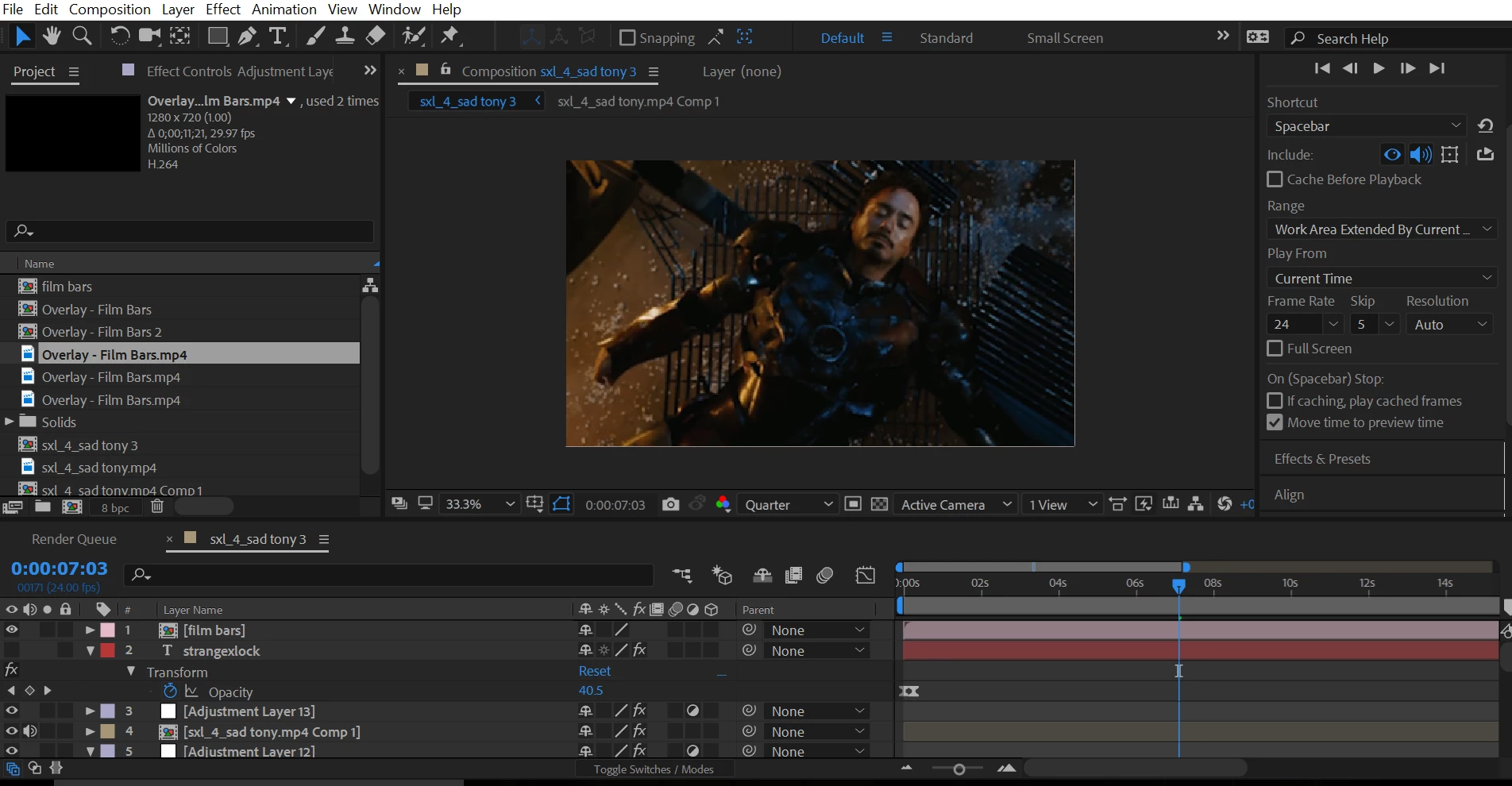 BTW, it also looks like you are using AE to edit a movie. It was never designed to do that. AE is for making shots that you can't make any other way. Premiere Pro is for editing those shots into a movie. Short sequences that cannot be created any other way are OK but most AE comps for most people that make a living doing visual effects and motion graphics are only a few seconds long. Most of my work is in dramatic films and most of my comps are one shot under seven seconds. I did a comp today that was only 16 frames long. I had to fix nine frames, it took 8 layers, motion tracking, blend modes, and about 3 hours and it was part of a nearly 12 second shot in a Premiere Pro sequence that would not work without those 16 frames being processed in AE.