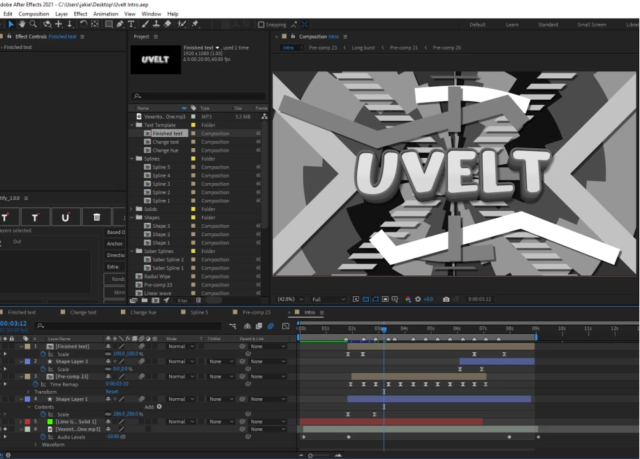 I got a 2D Intro shape pack and used a couple of the things items: Donuts, Splines (just random things from the pack). It might be because of all the shapes and media files in the project (excuse if thats obvious), but my specs are pretty decent so I thought it might be good.