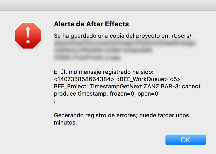 After Effects se cierra inesperadamente con mensaje BEE_Project
