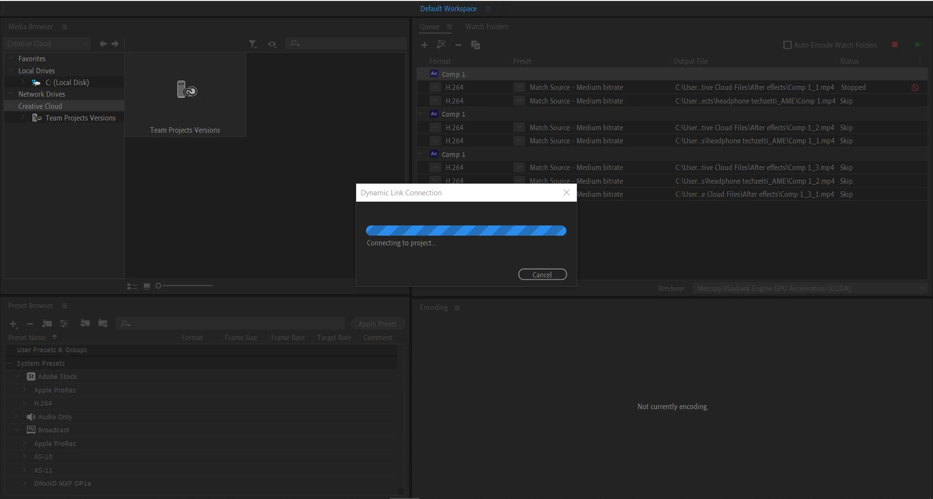 Hello anyone having this same issue and how can I fix this....When I try to export my after effects file and want to change settings it gets stuck connecting to dynamic link server and doesn't change again..i have attached an image below of how the problem looks like...Please I am currently using after effect v22.0.1 and media encoder v22.0 and I have tried downgrading after effects to use media encoder 22.0 but still doesn't work...can someone help me get this fixed I need to export a project for school work.