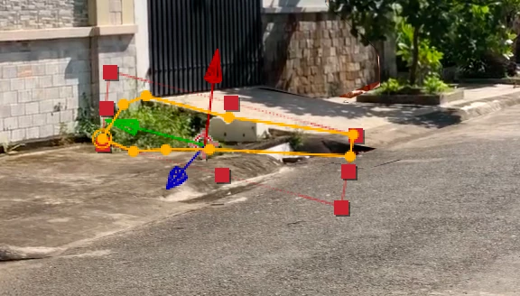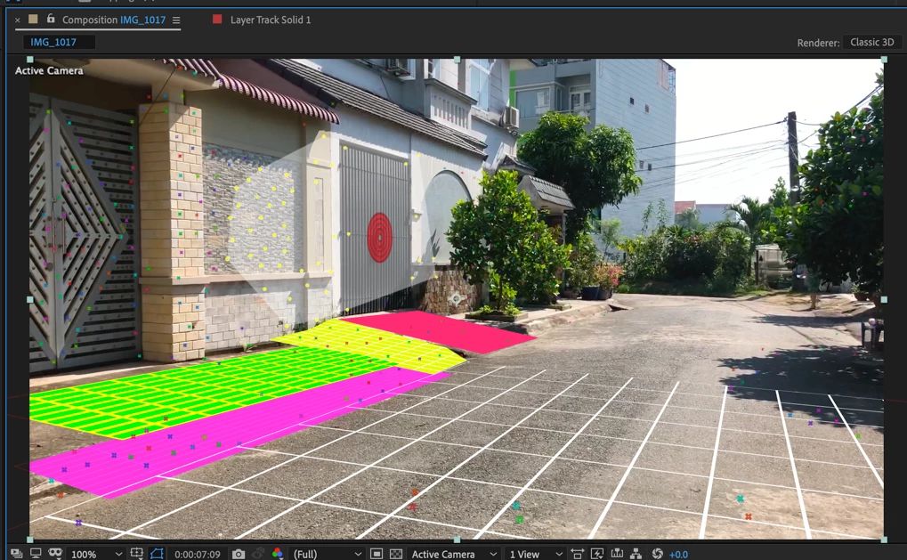 Here are some screenshots from a post I made a long time ago that shows how to track set up the 3D layers to align multiple surfaces in a scene.  I can't find the post, but if I do I'll put up a link. Your composite requires a similar workflow plus some masking (roto) as the perspective on the road changes.