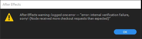 After Effects warning: logged one error - "error: internal verification failure, sorry! {Node received more checkout requests than expected}"