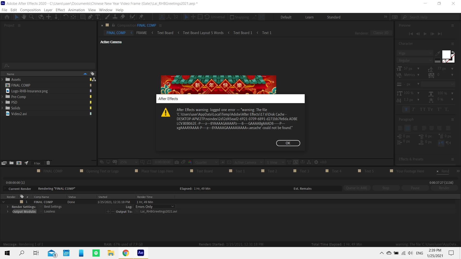 After doing all these changes, it always stops mid-way through the render and comes up with the error 'After Effects warning: logged one error - "error: internal verification failure, sorry! {Node received more checkout requests than expected}"'.