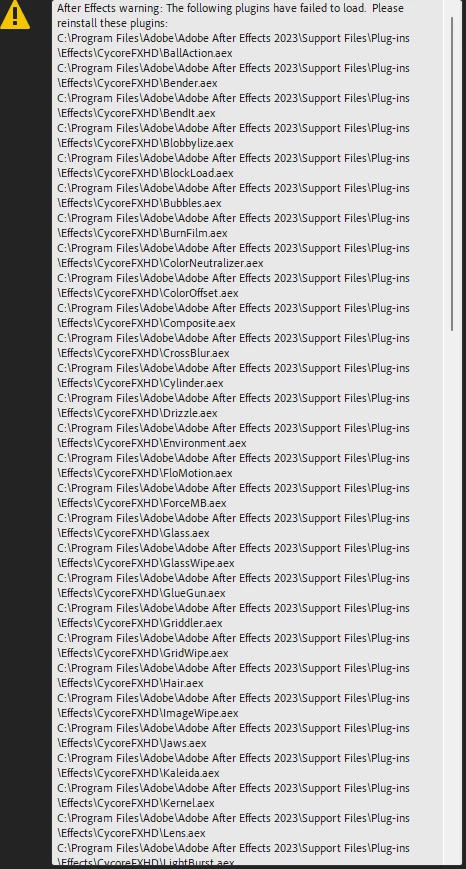 After Effects warning: The following plugins have failed to load. Please reinstall these plugins