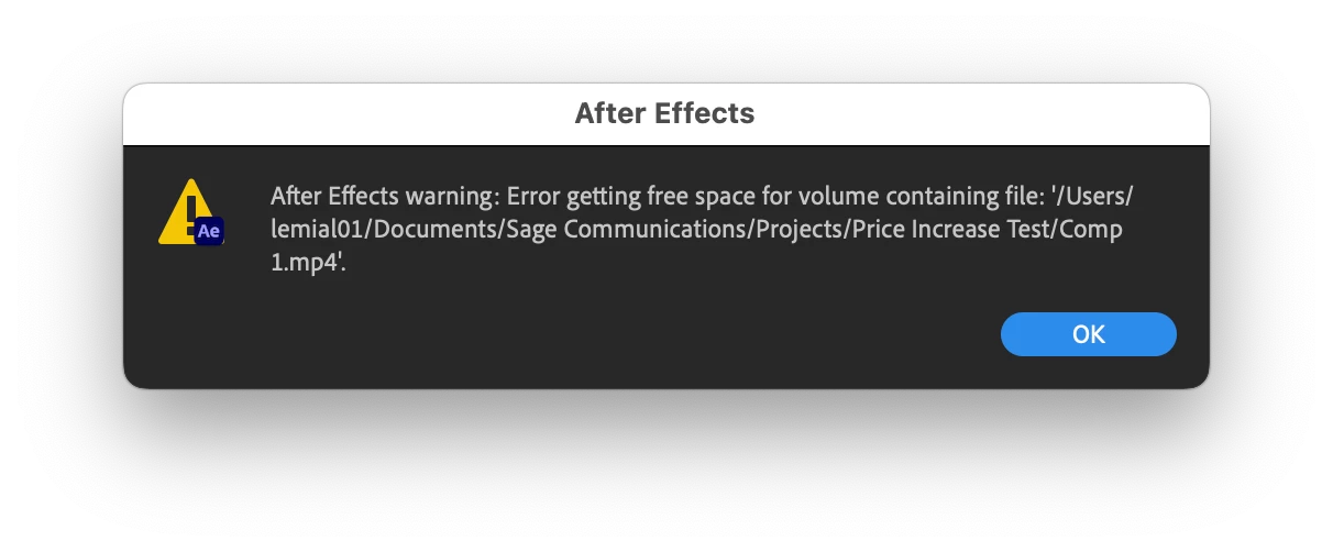 After Effects warning: Error getting free space for volume containing file: