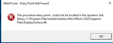 The procedure entry point could not be located in the dynamic link library C:\Program Files\Adobe\Adobe After Effects 2020\Support Files\DisplaySurface.dll