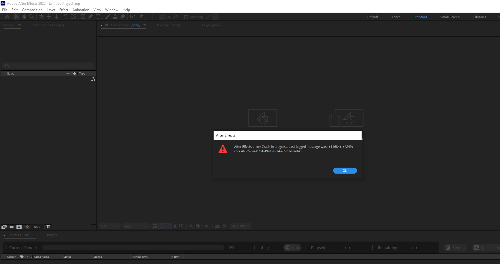 Greetings. Yesterday I attempted to launch After Effects in order to animate some gifs that were requested by some of our clients. However when I tried to launch the program, I got a window about a crash error, and the program would close shortly after. I tried to re-install the program, use the previous version, and even reverted some recent windows updates to see if those caused the issue, but there was no improvement.