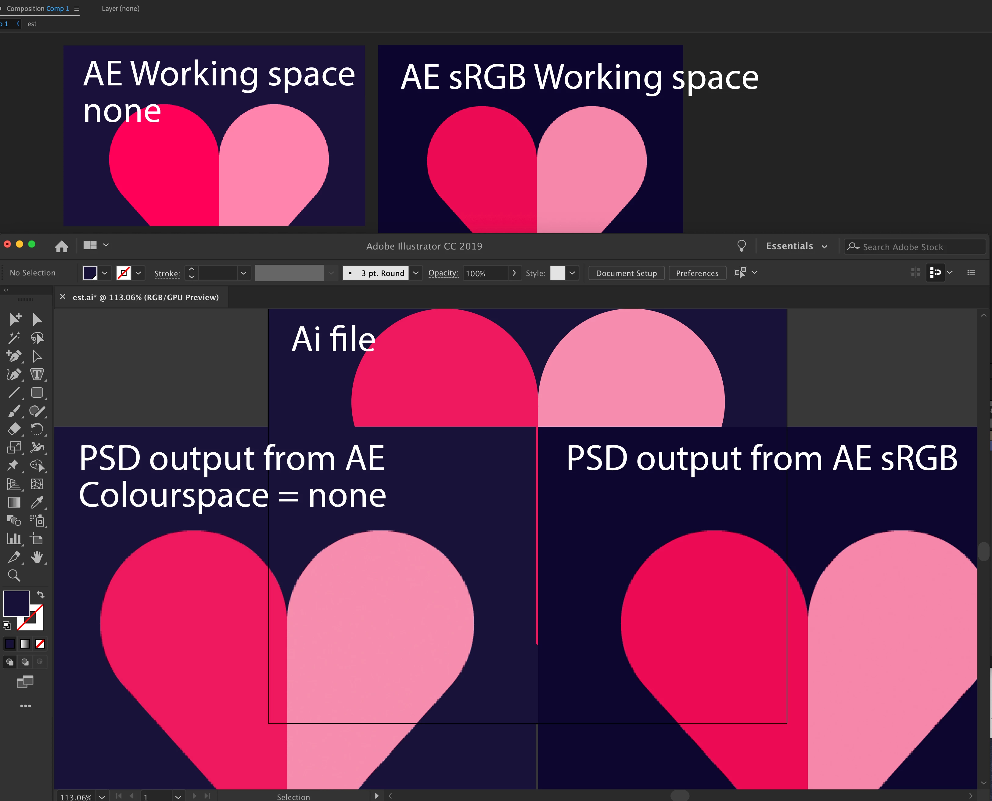 4 Ae to PSD using sRGB ≠ the colours match but both still don’t look like the Ai file.
