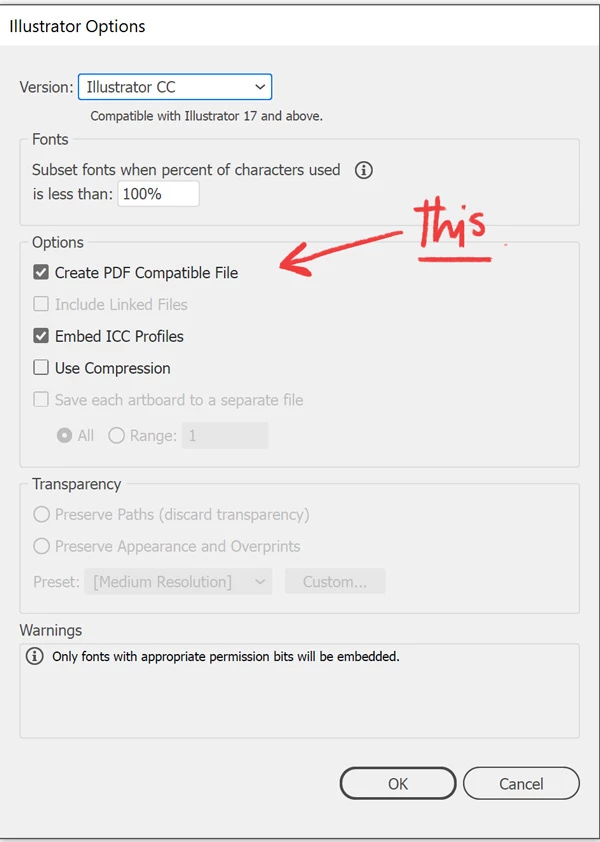 When saving illustrator file make sure "Create PDF Compatible File" is ticked: