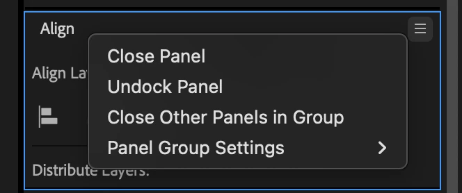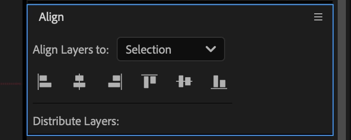 Align panel does not display the "Distribute Layers" options. Even when multiple layers are selected, the distribute alignment functions remain unavailable. This issue makes it impossible to evenly distribute selected layers horizontally or vertically.