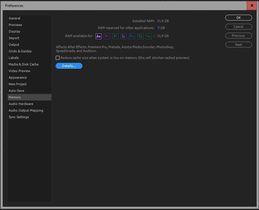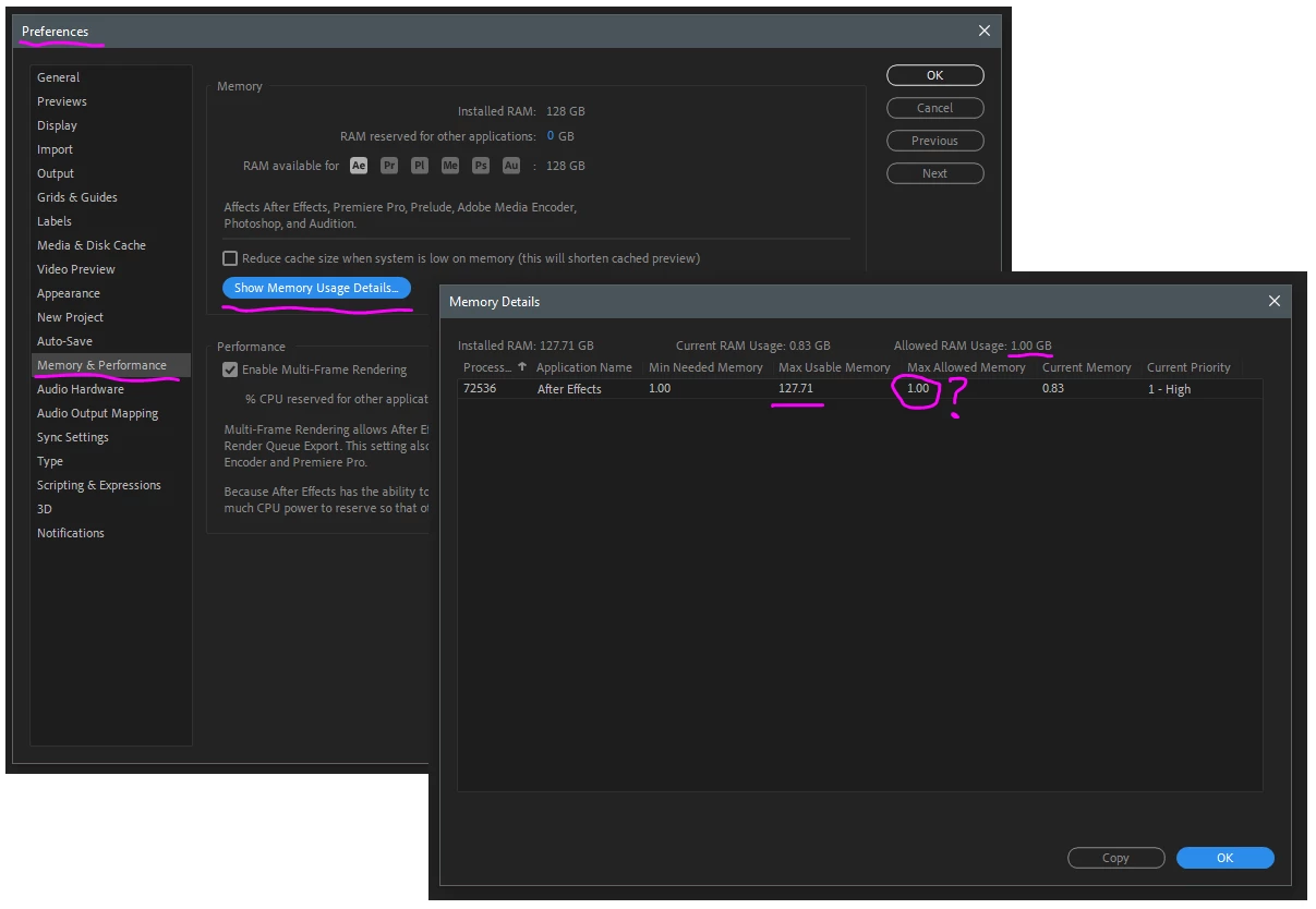 Hi. I just discovered after getting that 2 "främaes preview error" and a very short RAM preview when it's working that After Effects it's limited to use only 1 GB of memory from the 32 GB i have. I tried many solutions found on forums, uninstalled the AVG antivirus but didn't manage to fix it.