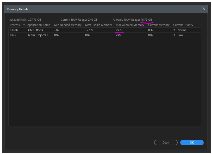 | Process ID | Application Name | Min Needed Memory | Max Usable Memory | Max Allowed Memory | Current Memory | Current Priority | |
