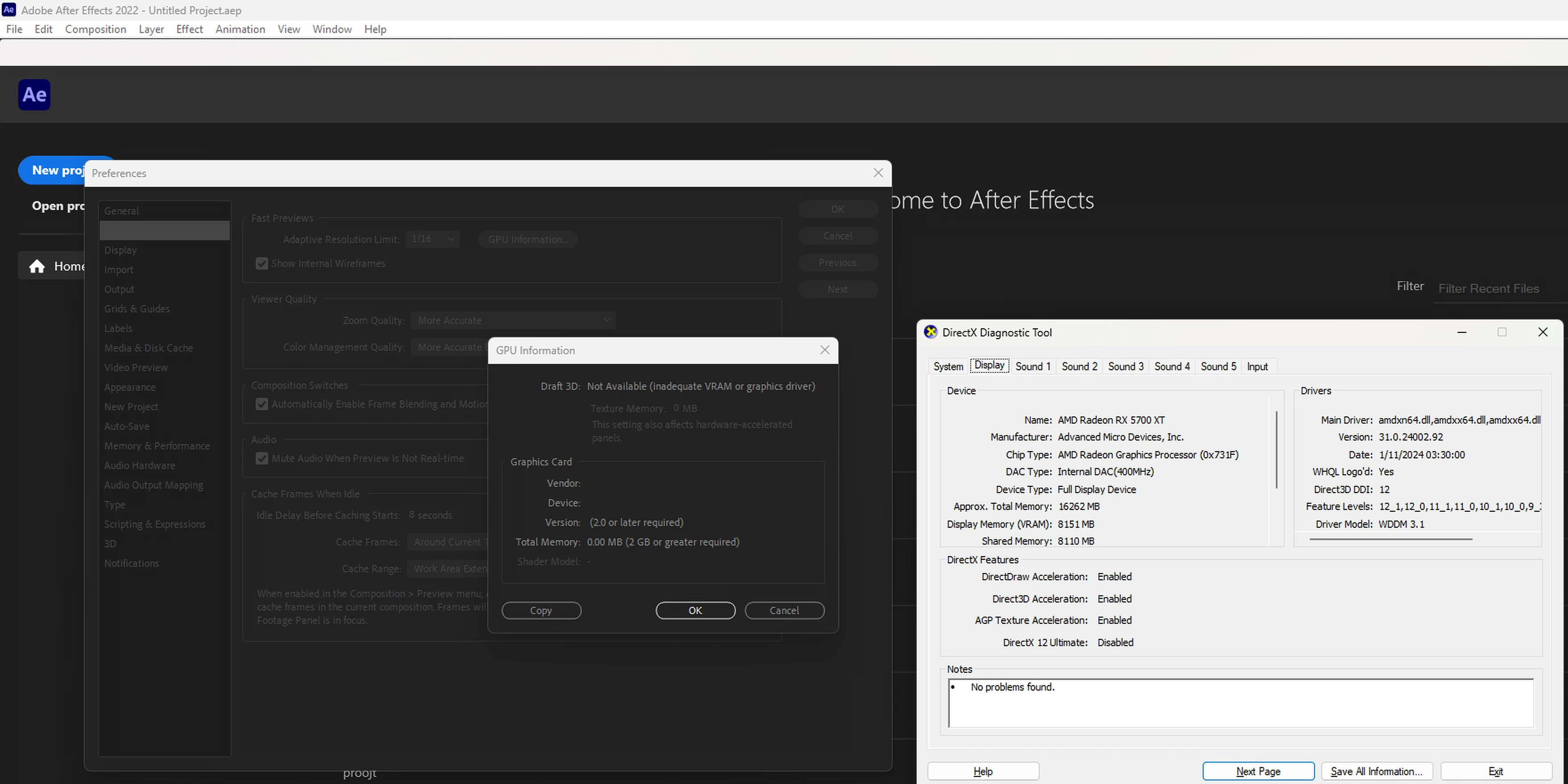 And now when I enter Adobe After Effects, it doesn't recognize my graphic card.