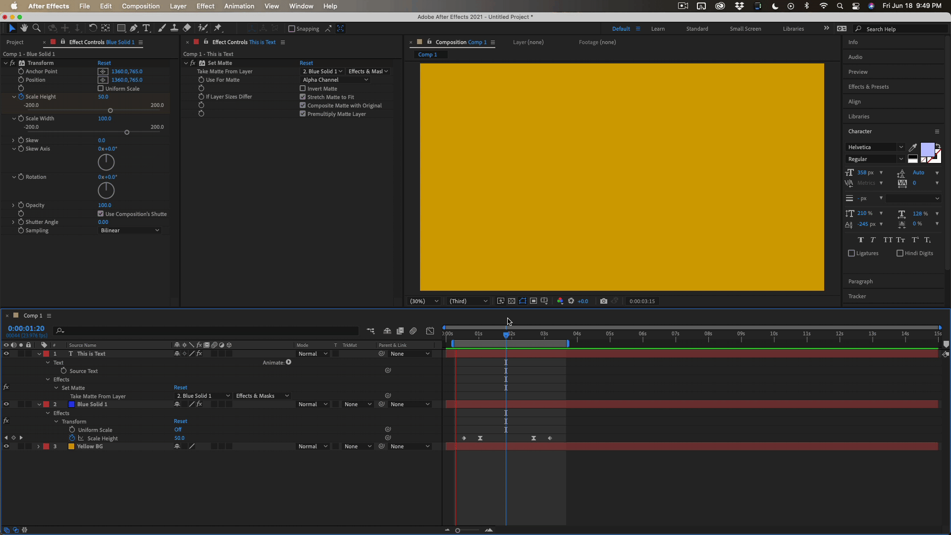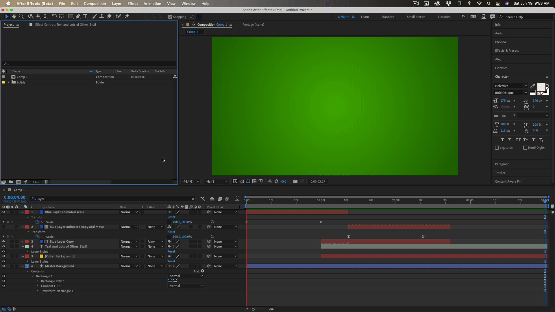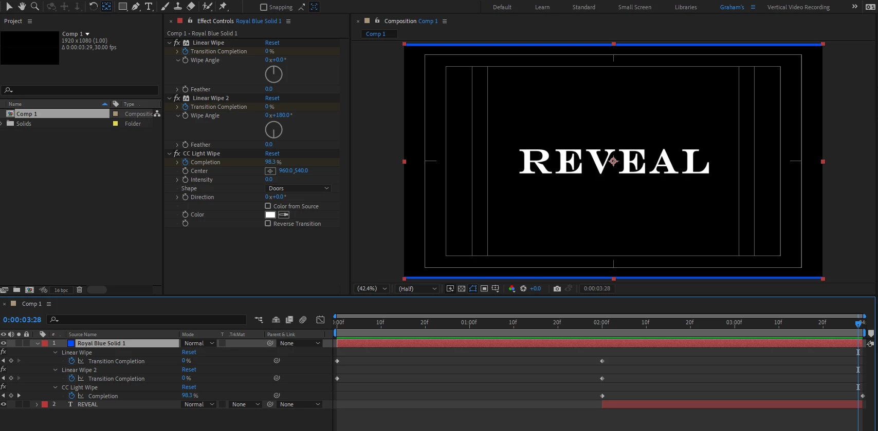 I am trying to create an animation where a blue solid is animated from the horizonal center and expands to fill the entire screen. Then a mask would use that same animation to then hide the blue to reveal another layer and text underneath of it. In short, the color would be filling the entire screen at the horizonal center, and then the solid would split at the horizonal center and the two halves would shrink near the top and bottom edges of the stage.
