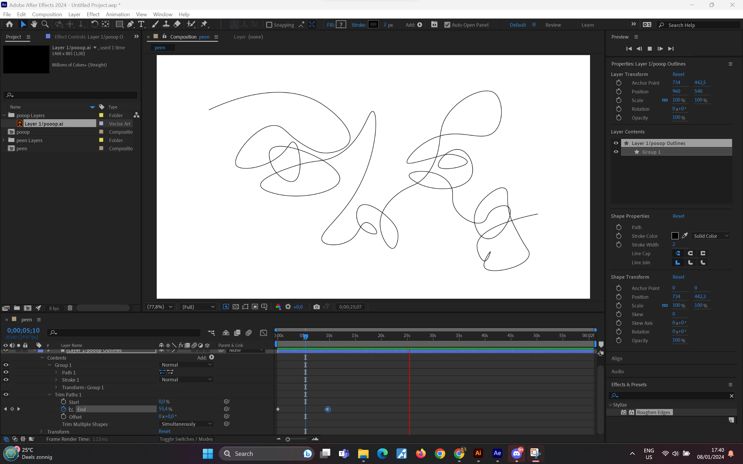 Hi, I am trying to do an extremely simple animation of a single line drawing from Illustrator. I have figured out to do it when I use the pen tool (Image A)- however I would prefer to use lines created drawing freestyle. However when I import a freestyle line to After effects, it does not register the correct path. Is there any easy way to fix this?