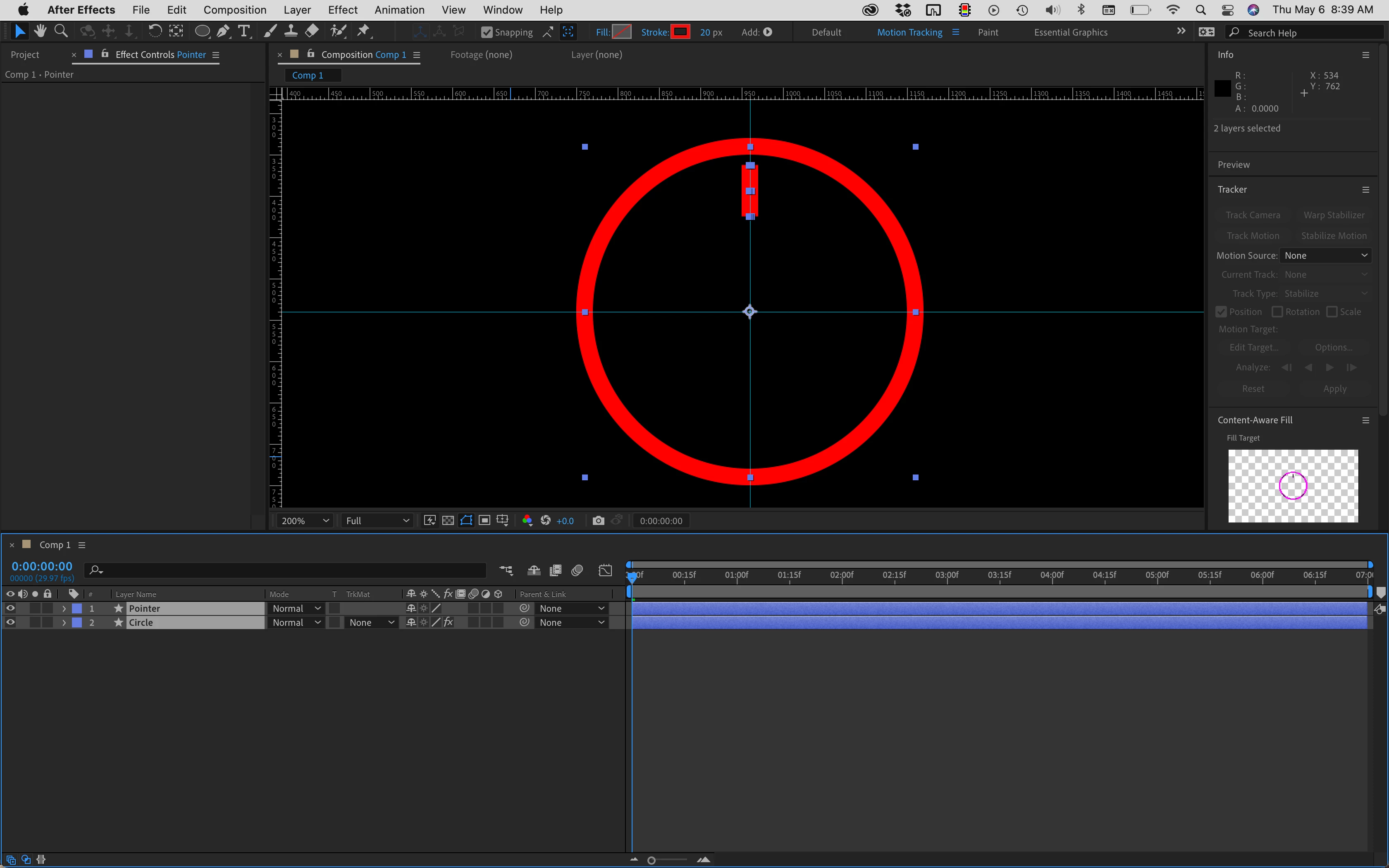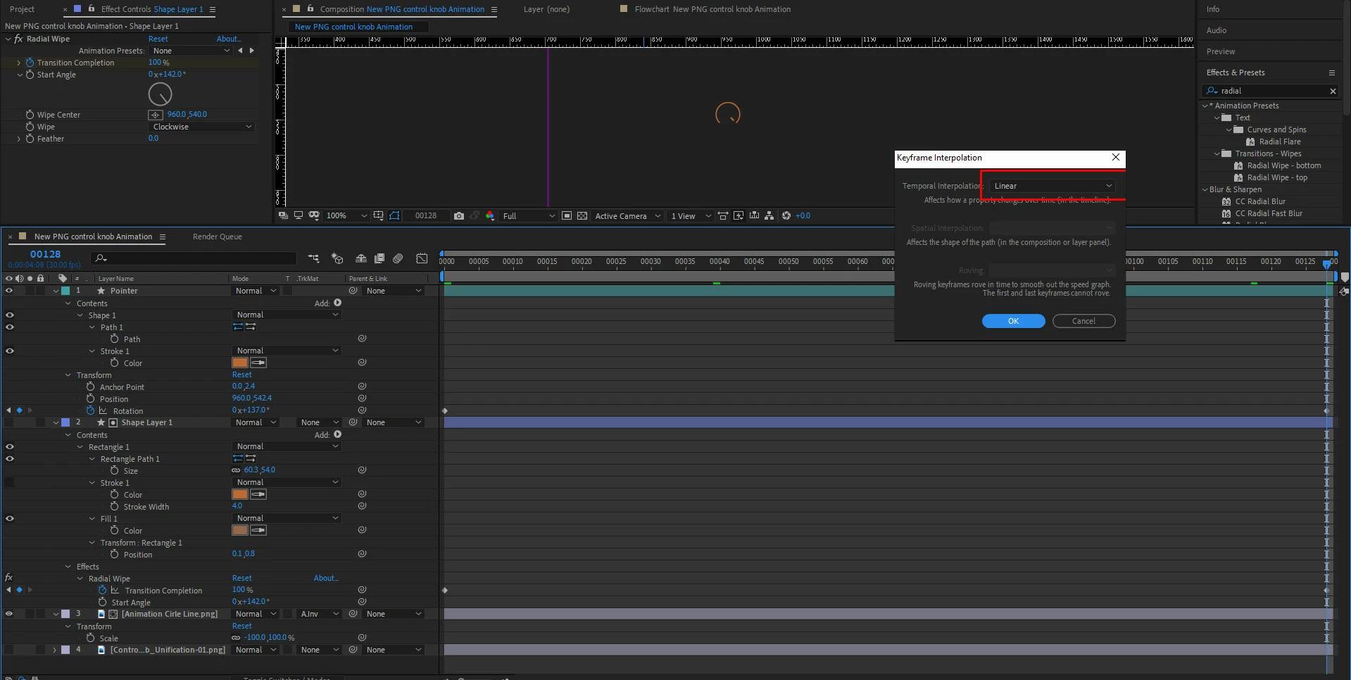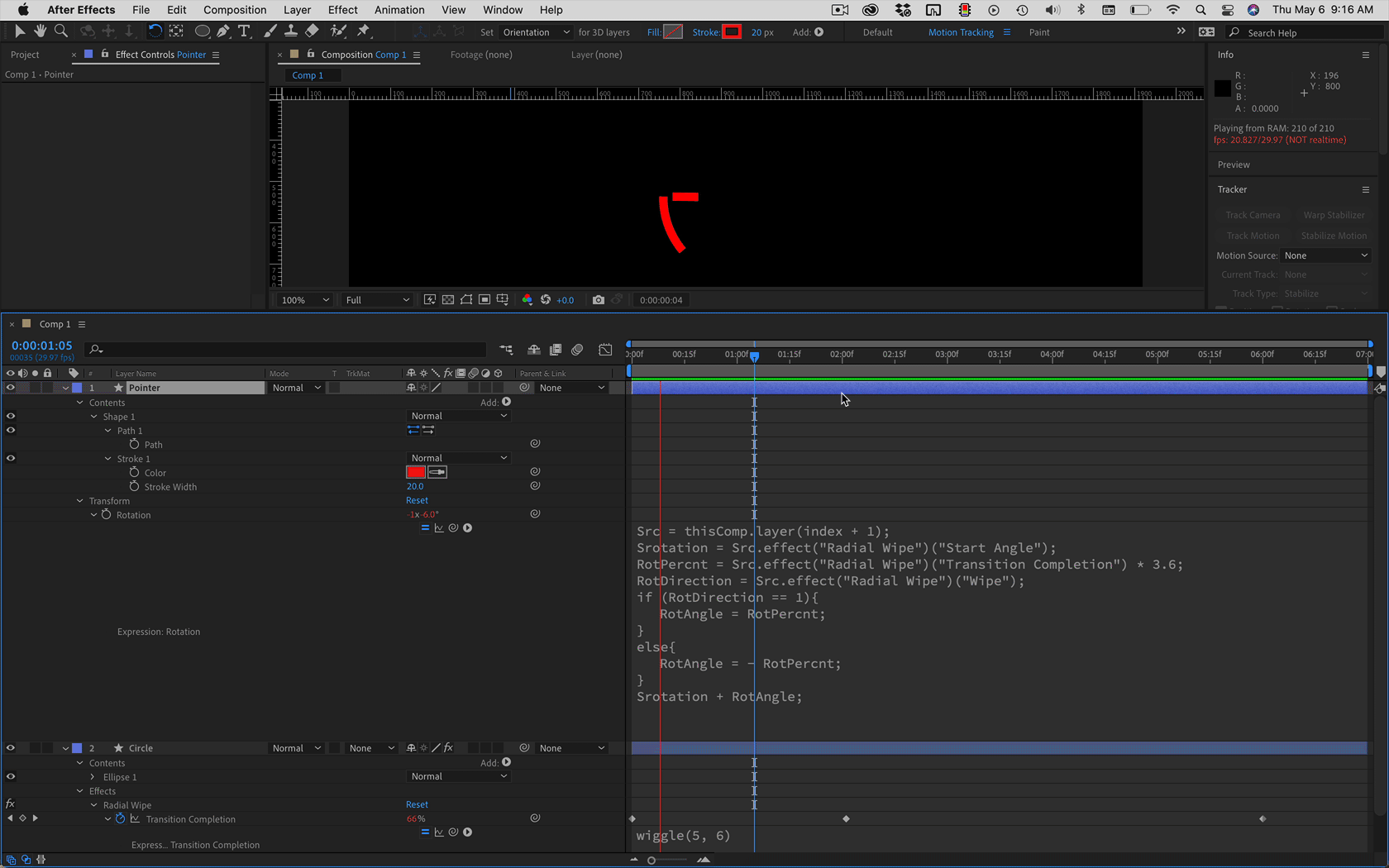 Radial Wipe has 5 properties. Transition Completion(%), Start Angle, Wipe Center, Wipe (direction), and Feather. Feather has nothing to do with movement so you don't need to consider that to set up the animation. By far the easiest way to set up this animation so you can easily modify the timing is to tie the rotation of the Pointer line to the Transition Completion percentage and the Start Angle. The math is pretty simple. To convert the Transition Complete to an angle just multiply the value by 3.6. All you have to do to match that to the Start Angle is add the two values. To change the direction you need to add an if statement that looks at Wipe direction and makes the value positive or negative. Here's how the expression for Pointer Rotation looks if the Circle layer is below the Pointer: