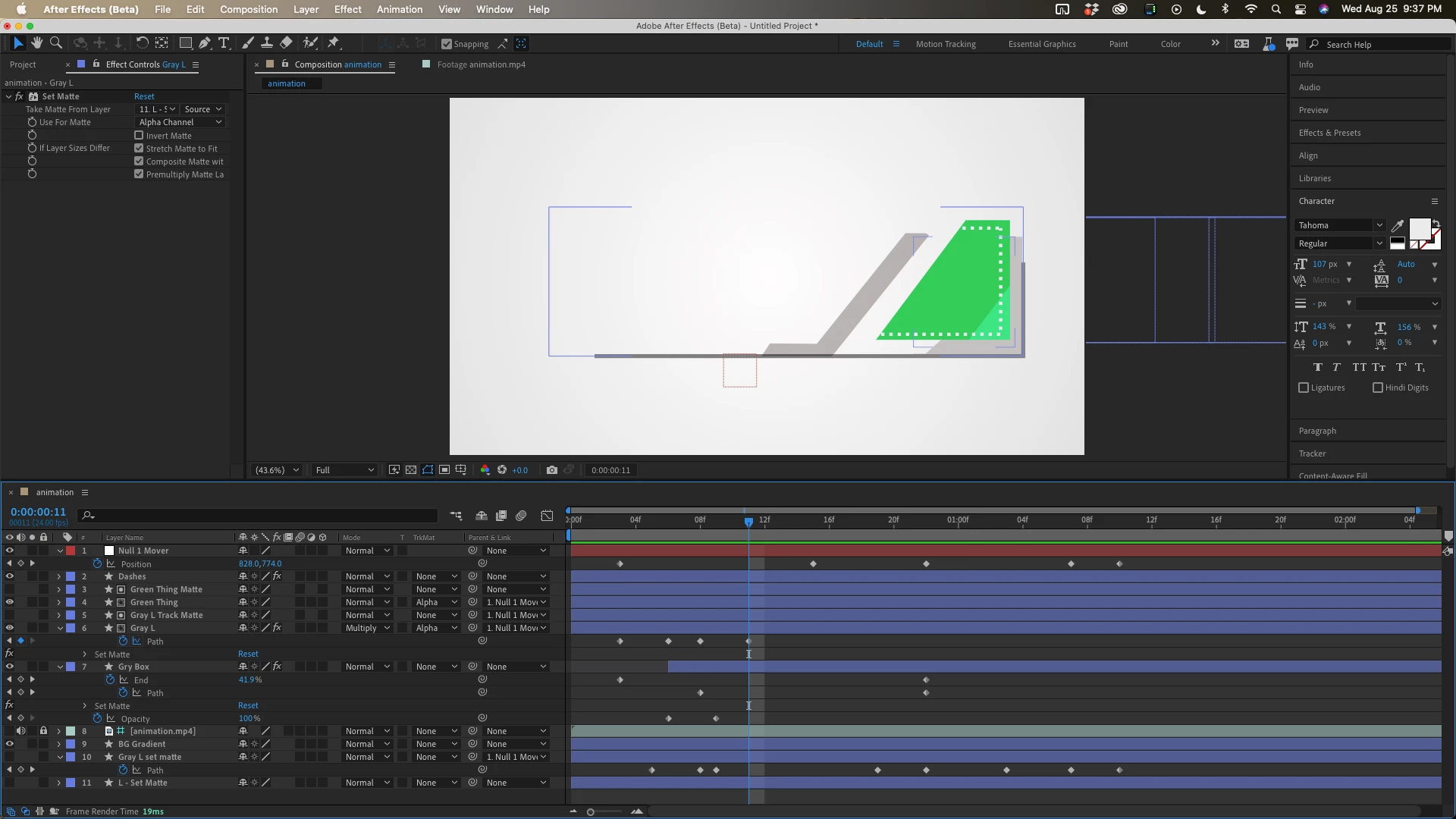he used a simple way than this he used the effect ''linear wipe'' with an oblique square with drop shadow inside a track matte rectangle !