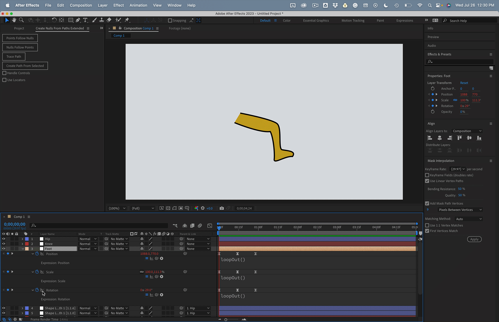 You could clean up the timeline by making all of the nulls created by the script shy layers and turning off their visibility, then just animate the position, scale, and rotation of each of the nulls to make the leg move. If you set a keyframe for the foot moving to the most forward position, then one for the most backward position, then copied the first keyframe and pasted it in ahead of the second keyframe, a simple loopOut expression would make the leg move continuously.