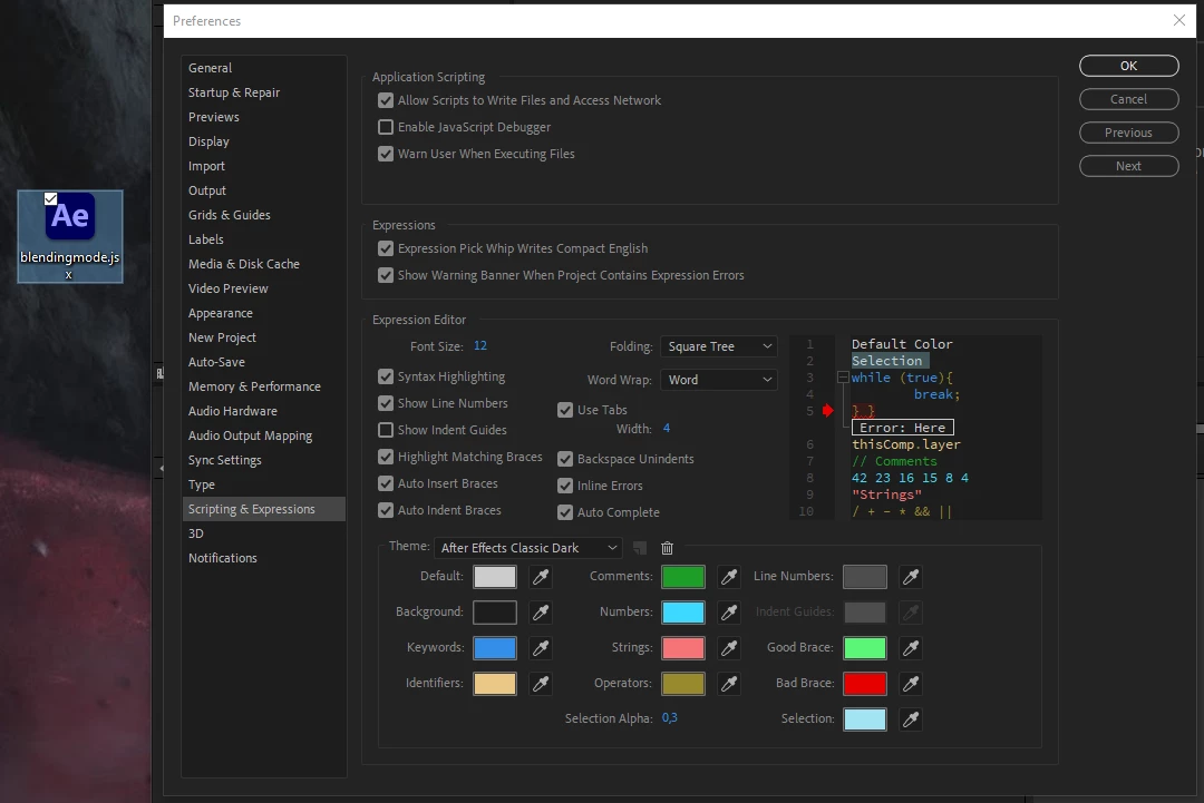 In all the process I described, I didn't touch any parameters in After Effects. I just oppened the .jsx file with notepad++ and made it the application by default, unintentionally.