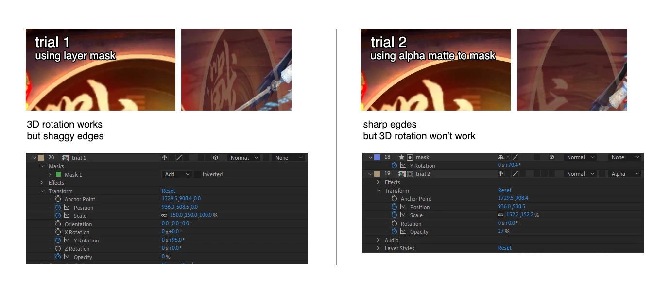 Using alpha matte to mask out can leave the edge sharp & clean, but 3D rotation won't apply. I've tried using null object to control the 3D rotation (got the both mask and layer parented), but then the layer won't do the alpha matte mask.