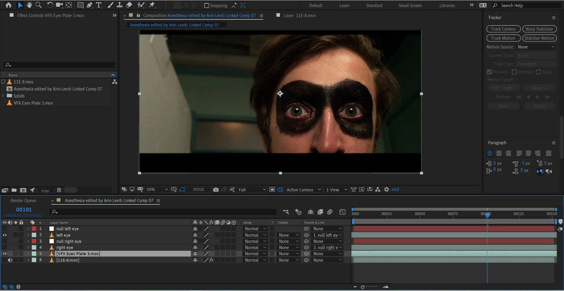 I've got to stick a couple of eyes on a monster's face. Not a big deal, if it wasn't for the fact that the eyes in question are on the footage of a man, moving and blinking. I duplicated the footage, created a mask, motion tracked in order to get the eyes out, no big deal. But the eyes are moving, because the guy with black paint around his eyes is moving.