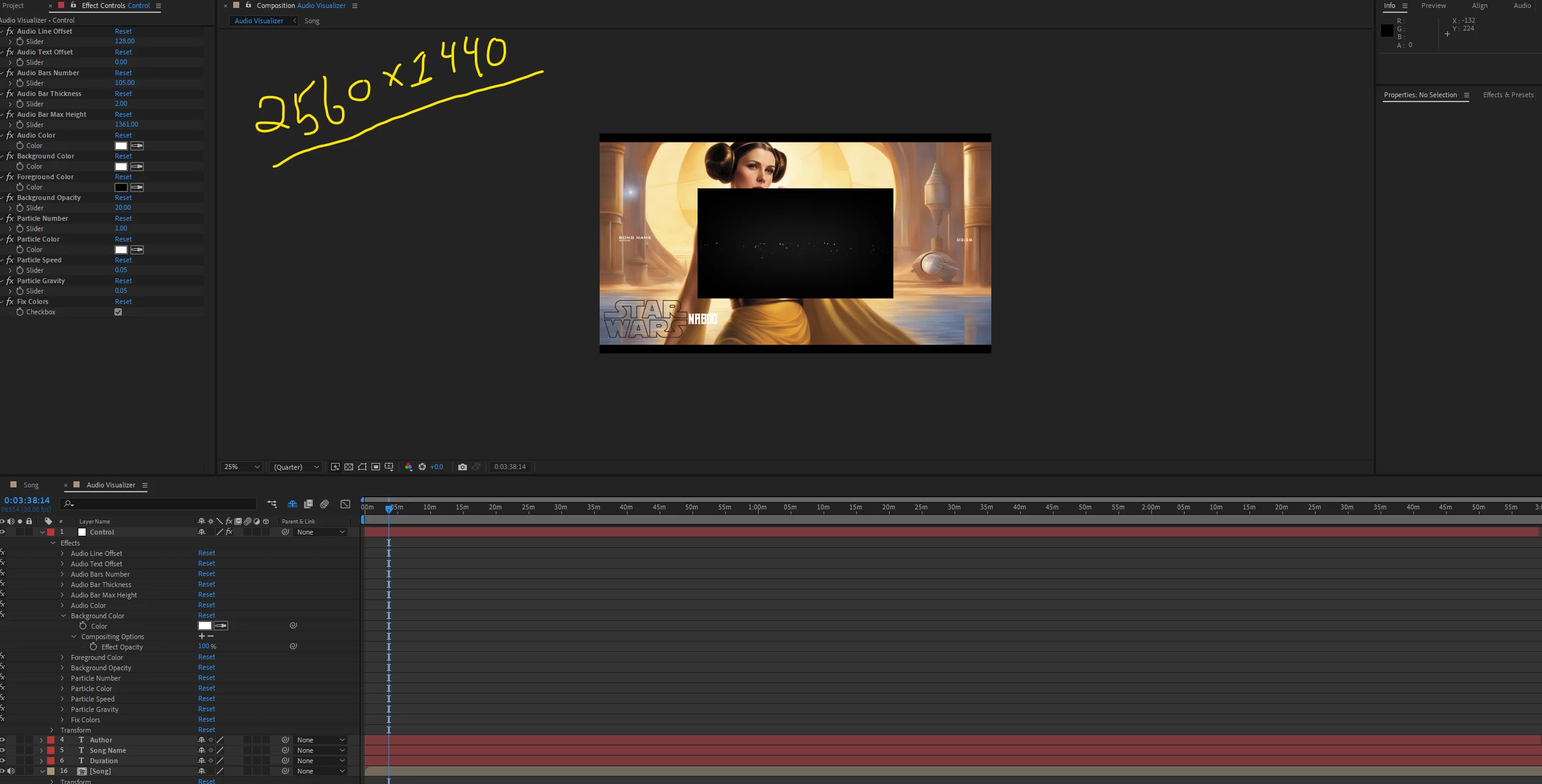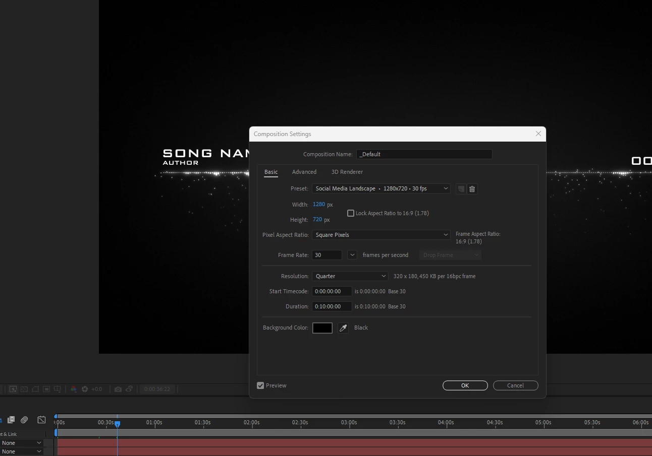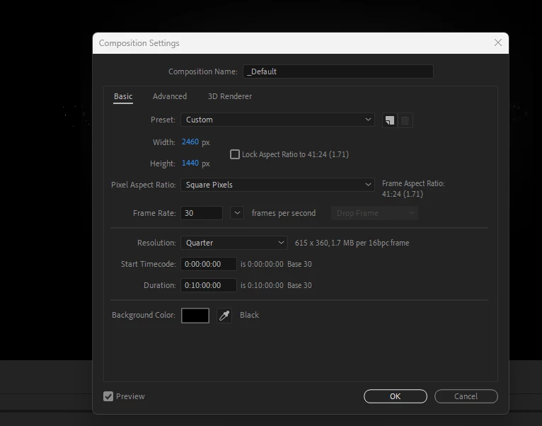 1) When I increase the composition size in compsition settings it wont be visible anymore as seen below in the first 4 photos (Changed from 1280px width - 720px height TO 2460px width - 1440px height)