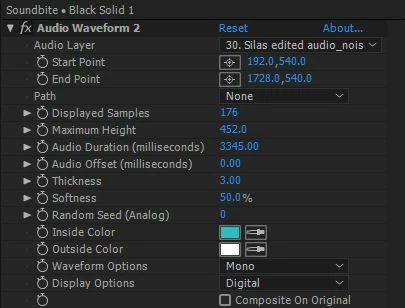 Right-click on the modified audio duration and reset it and your problem goes away. The shape of the waveform may not be to your liking so you can adjust the audio duration to get a better shape. If you really want a sample duration of 3 seconds then you can adjust the timing by sliding the audio offset in a negative direction. Audio waveform creates a moving waveform that corresponds to the next x seconds where x is the audio duration. If you just want the line to change shape but stay where it is on the screen you need to use audio spectrum.
