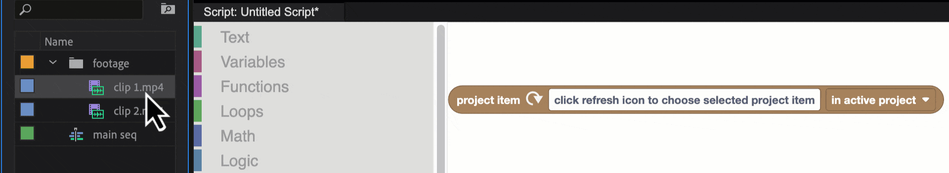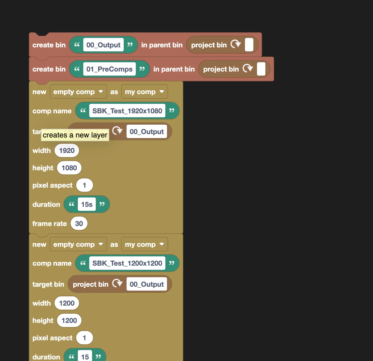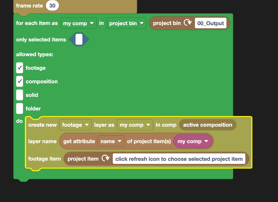 The "For Each Item" blocks, or "create new footage" blocks aren't entirely intuitive about what I can put where.