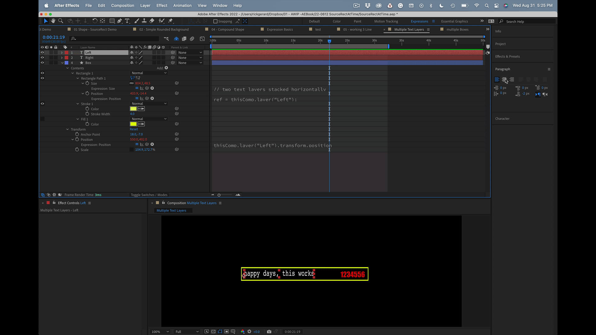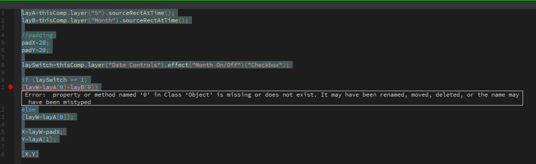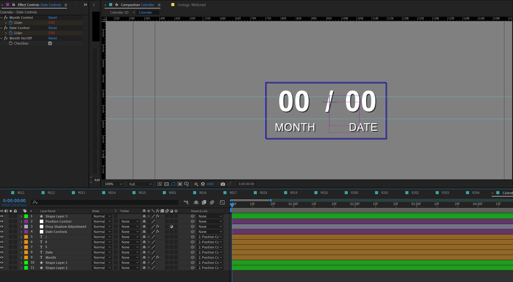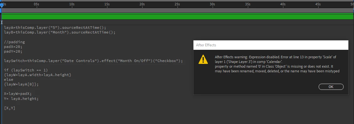 I wanted to ask about some expression and how to do it. So I have this shape layer, and I have two text layer. I have created a null object with a check control. And that has the control to turn the opacity of the "Month" text layer and the "00" number text layer. And I want to resize the width of the blue shape layer if I turn the check control on and off. I want it to resize it fit only the "Date" and the "Date number" text layer. Is that possible with sourceRectAtTime ?
