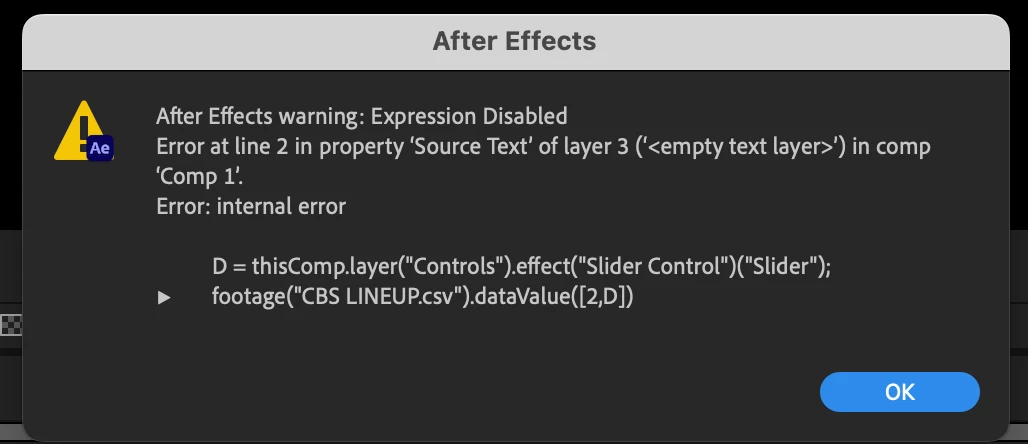 I get an Expression error : "Error: internal error", when trying to get data from "dataValue([2,5])"