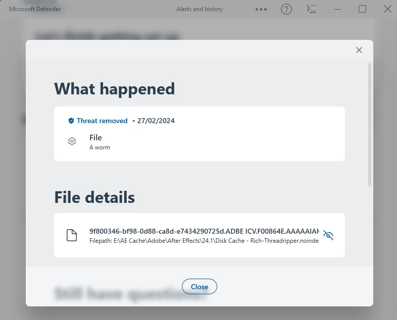 AE has been giving me errors that it couldn't access cache files on render and I find now that Microsoft Defender is identifying the files as a Worm and deleting them. Is this a Defender error? Or do I have some known infection?