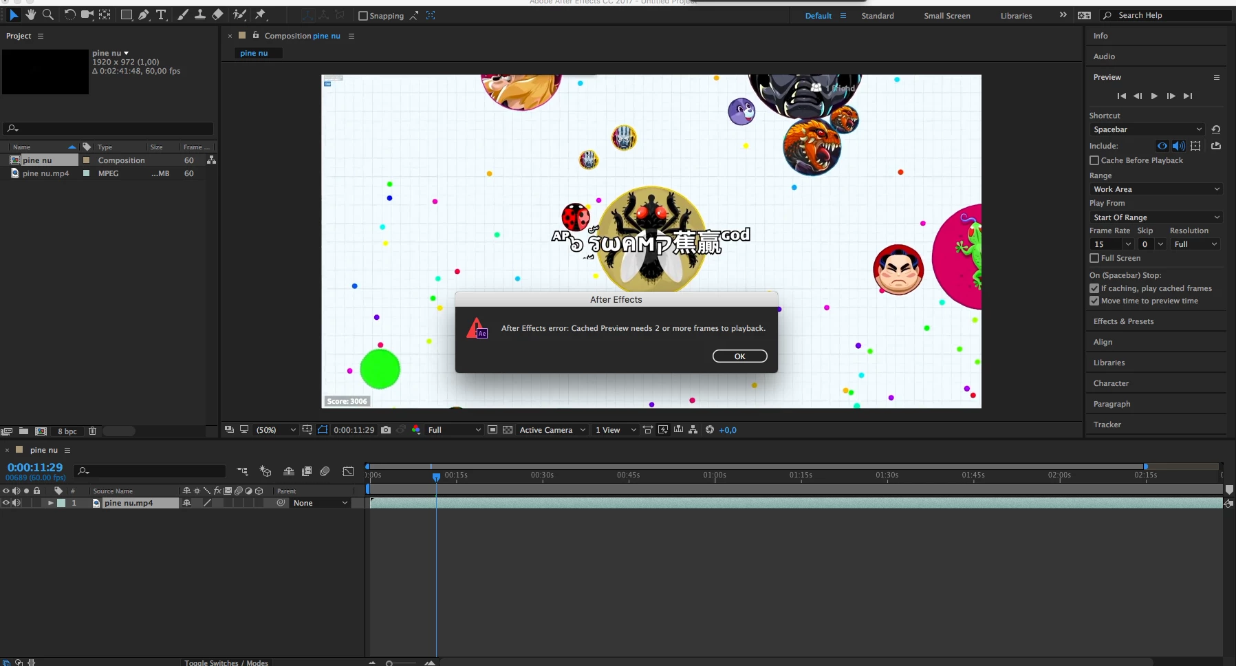 When I try to preview what I am working on in my composition by pressing my space bar and clicking on the play button, I get this pop up message: "Cached Preview needs 2 or more frames to playback". When I click OK, I usually get the following pop-up: "Fresh layer cache check-out failed".