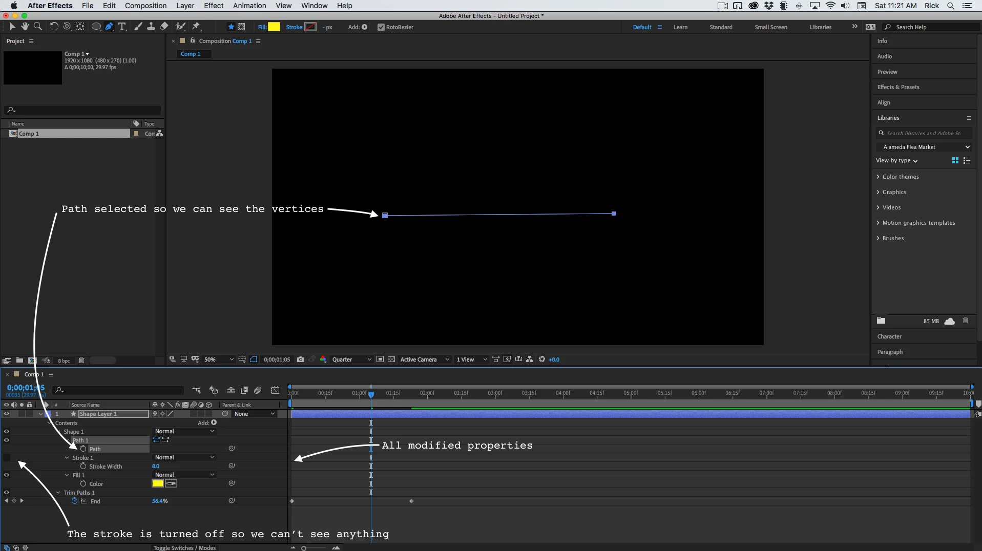 The only thing your screenshot tells us is that there is a path in Blue Layer Shape 1, Trim Paths has been animated, and the Fill effect has been applied to the layer. All other properties appear to be at their default values. The way to figure out what is going on in a layer is to select it, press 'uu' then look at what you see. If you can't figure it out, send us the entire screenshot.
