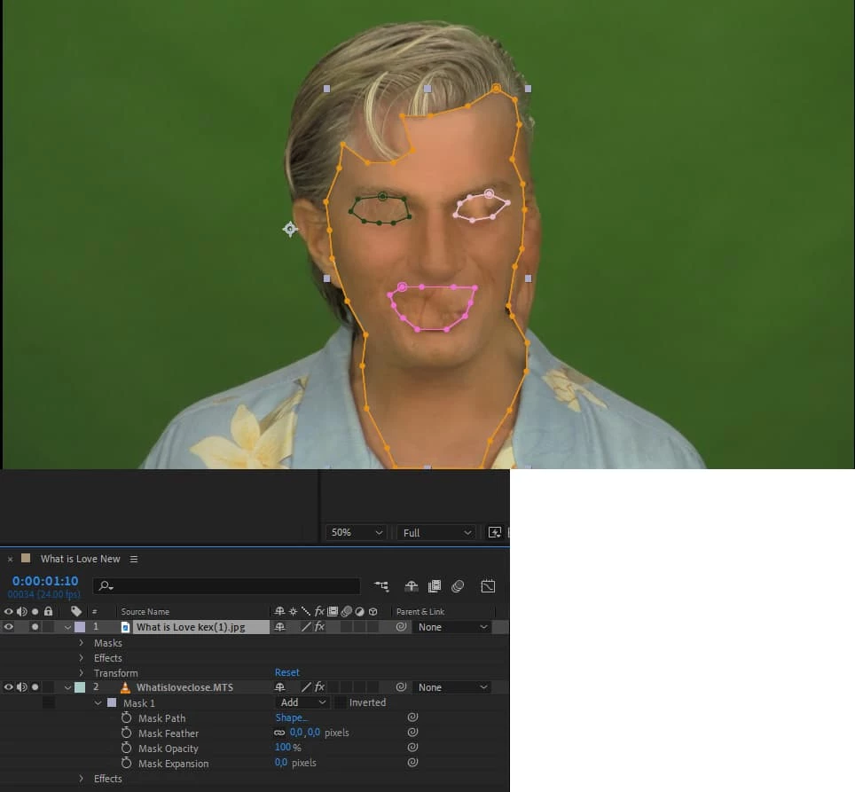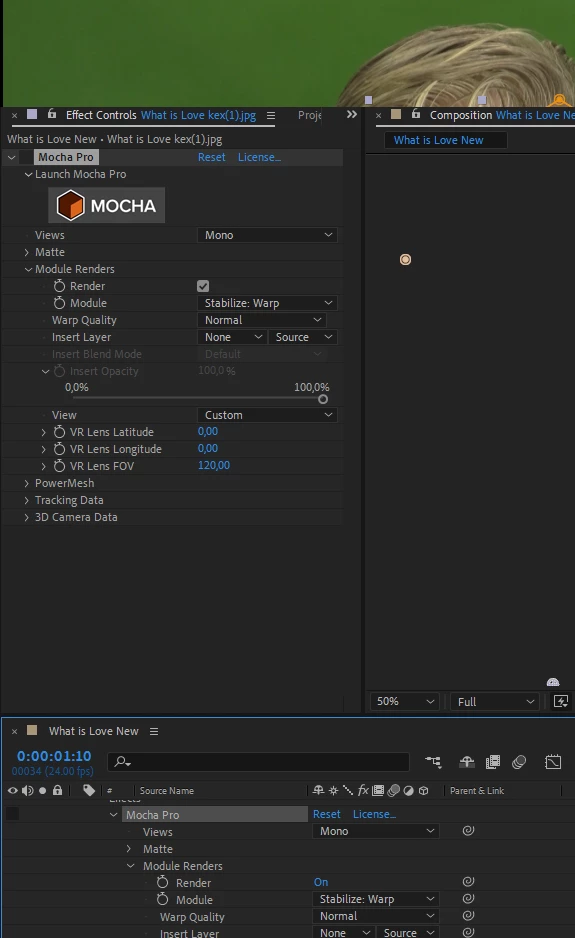 In the overlying track with the mask that I want to track the face, render is on with warp stabalize.