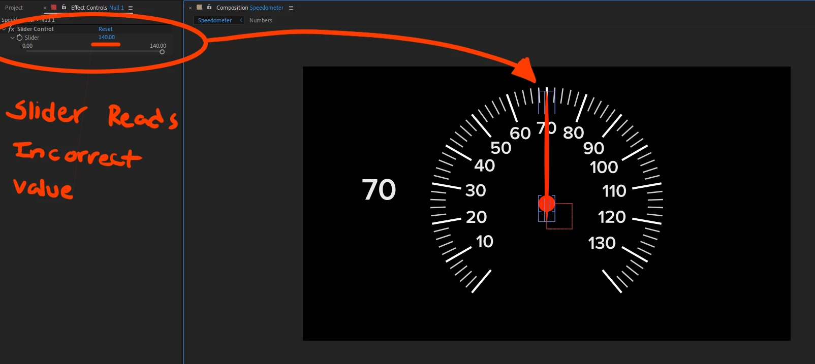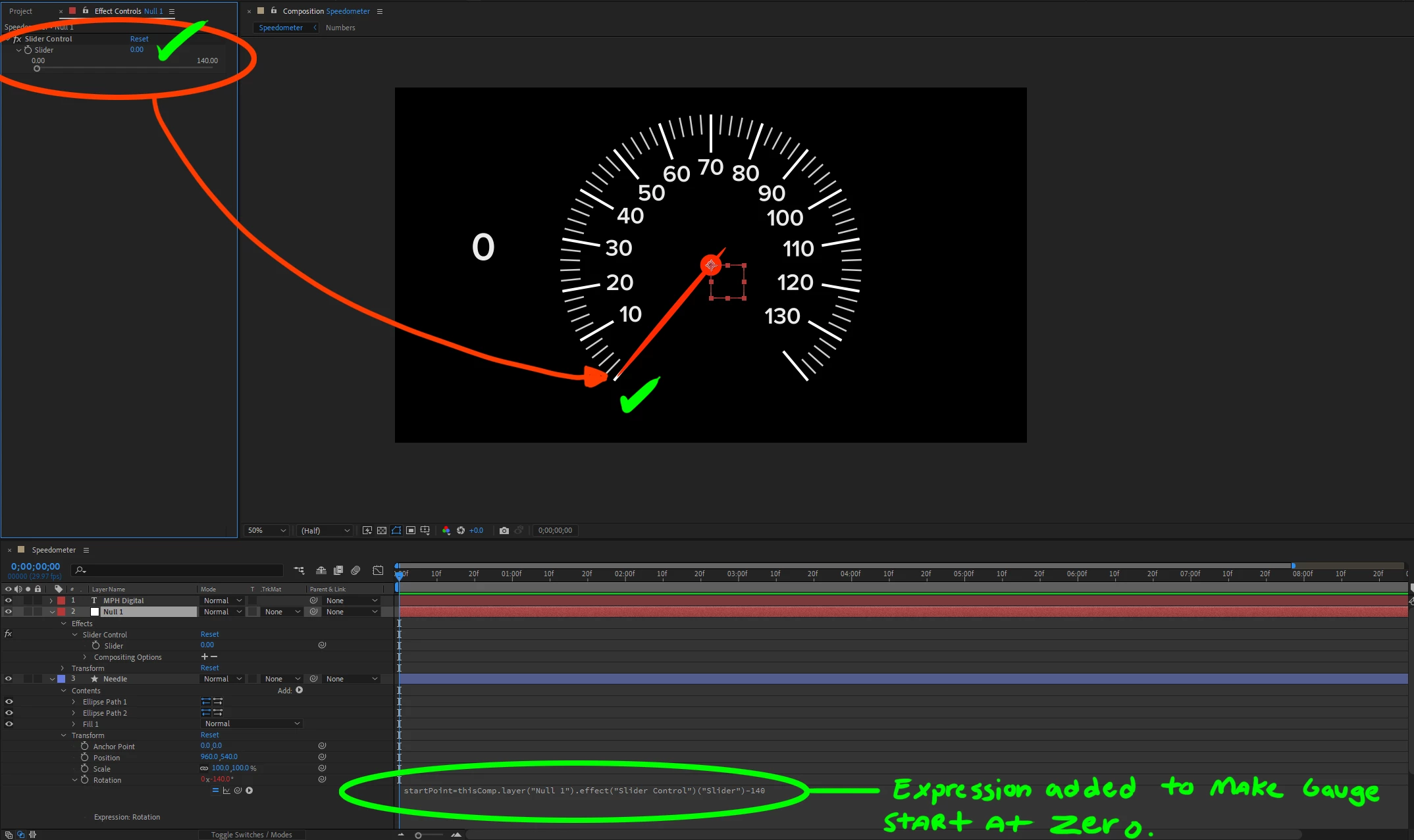 I knew the rotation rate wouldn't match the gauge at first so I started looking for a solution to this problem. I came up with this expression to try and solve the issue. I pasted it in the "Slider" because I don't know how to make it work from the Needle layer.