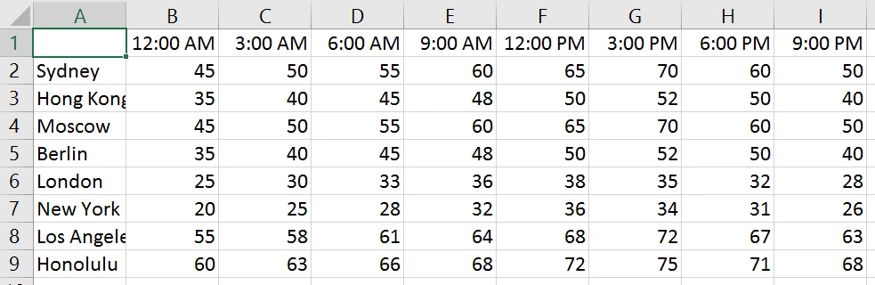 File is dirt simple, 8 rows and 8 columns of made-up integer data ("temperatures" in various cities), with header row and columns. Screenshot at bottom, file available at