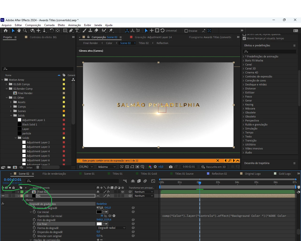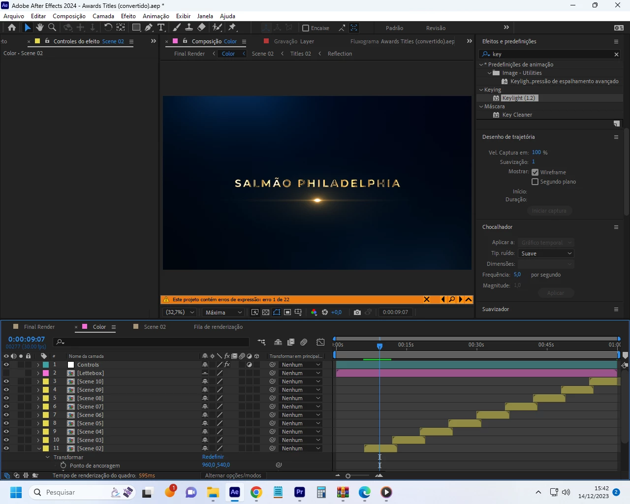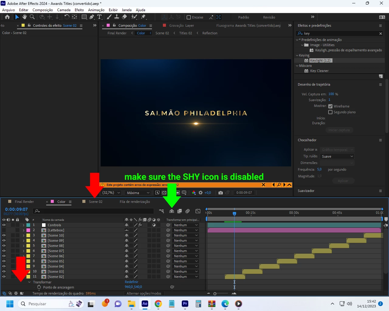 Begin by checking layers in the "Color" composition, then proceed to "Scene 02," and so on...