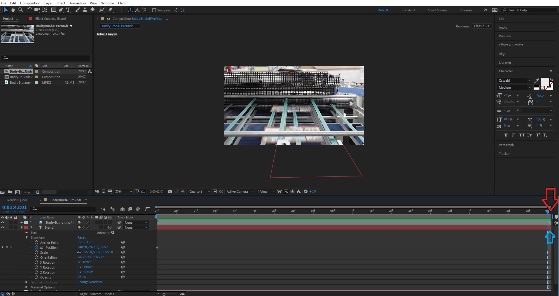 There are 2 arrows, a red one and a blue one. The red arrow points at the timeline. This shows that the end of the timeline has about 1/4 of a frame left for the scrubber to pass by; however, this very important footage is skipped and when hitting the space bar (which plays my clip repeatedly) the scrubber continually skips this portion. The blue arrow point at my clip. You can clearly see that there is 1/4 of a frame of footage left to scrub and/or play in the timeline; however, when I grab the scrubber and try to move it over this section, it fails to do so and stays in its current position. This action makes it seem that After Effects thinks that the end of both the timeline and my footage is 1/4 a frame short of where it actually is.