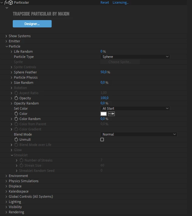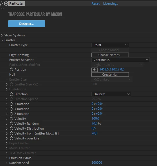 I have problem - I can't see some of parameters of Trapcode Particular in After Effects: Paricles/sec, Size of Particle... Also if I make changes in interface of Trapcode Particular by button Designer in Effects Menu, I can't change keyframes of these parameters in After Effects...