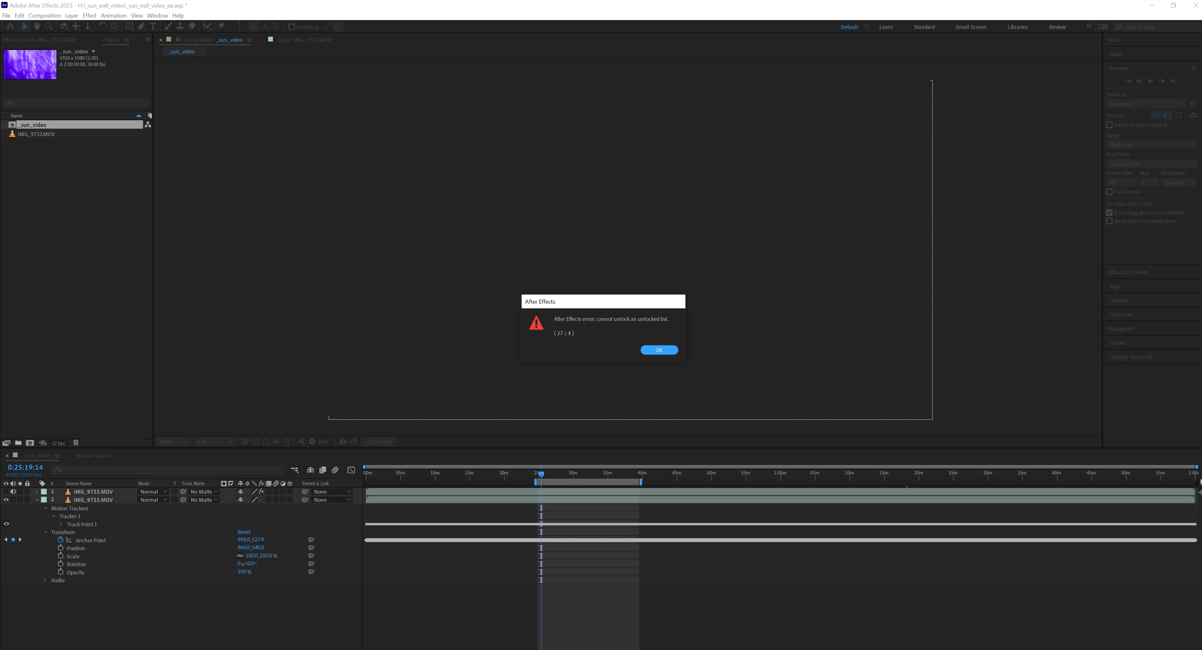 "After Effects error: cannot unlock an unlocked list"