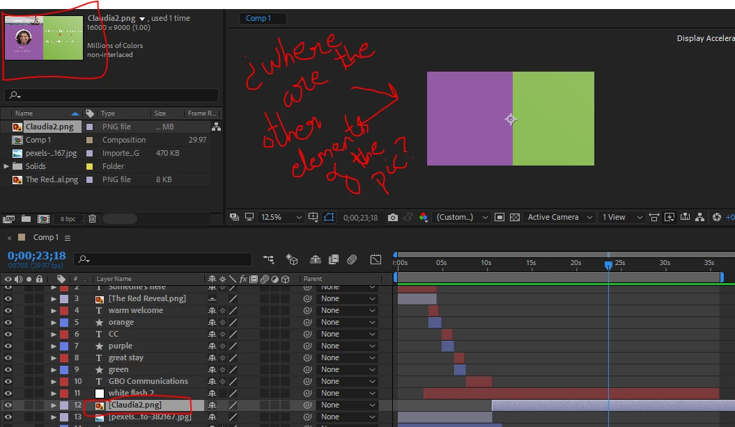 However, when I drop the png in the AE timeline, all is see is the purple and green frames. I am unable to view the other elements on my png. I am not sure why this is happening. Upon rendering the timeline as well, all I see is the purple and green bits of the png. I have completely hit a wall, and any guidance would be appreciated. Thank you.