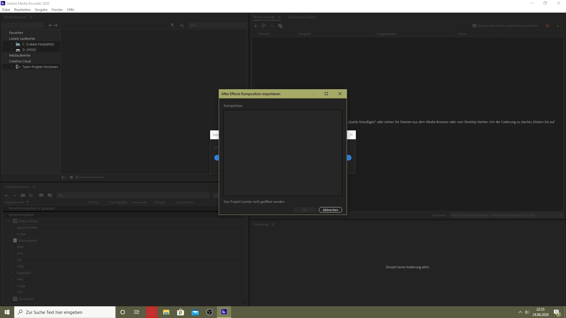 I cant import an After Effects file to Media Encoder. If I try to import it through After Effects, it opens Media Encoder and nothing else happening. If I import the file manually, it says: project could not be opened