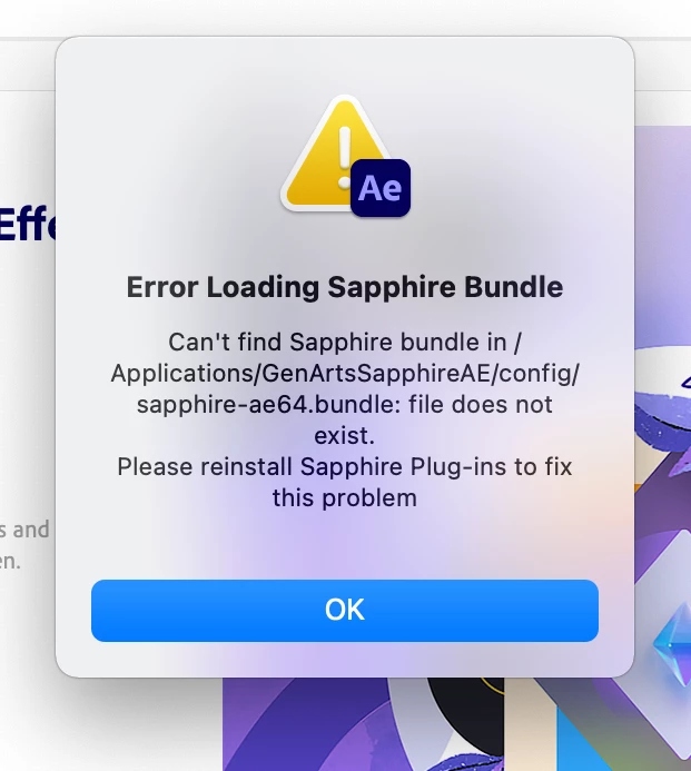 Can't find Sapphire bundle in /Applications/GenArtsSapphireAE/config/sapphire-ae64.bundle: file does not exist. Please reinstall Sapphire Plug-ins to fix this problem