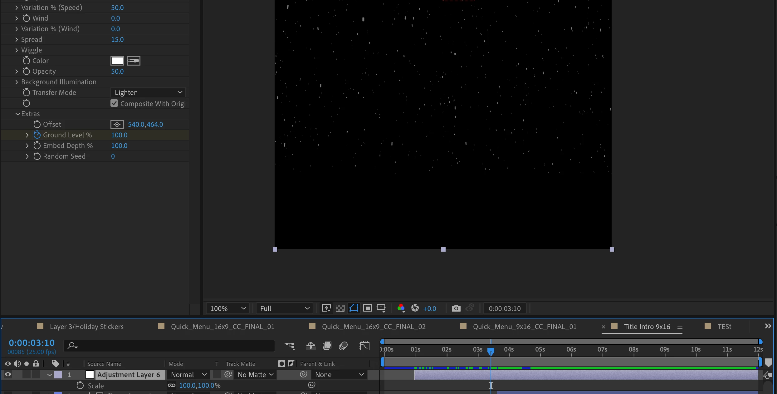 If the shot has 3D or multiple 2D layers, you can insert copies of your snow or rain layers between them with slightly different settings to create a more realistic snow effect. Masks used in Compositing Options for these kinds of particle effects can simulate snow falling under street lights or being blocked by trees or awnings.